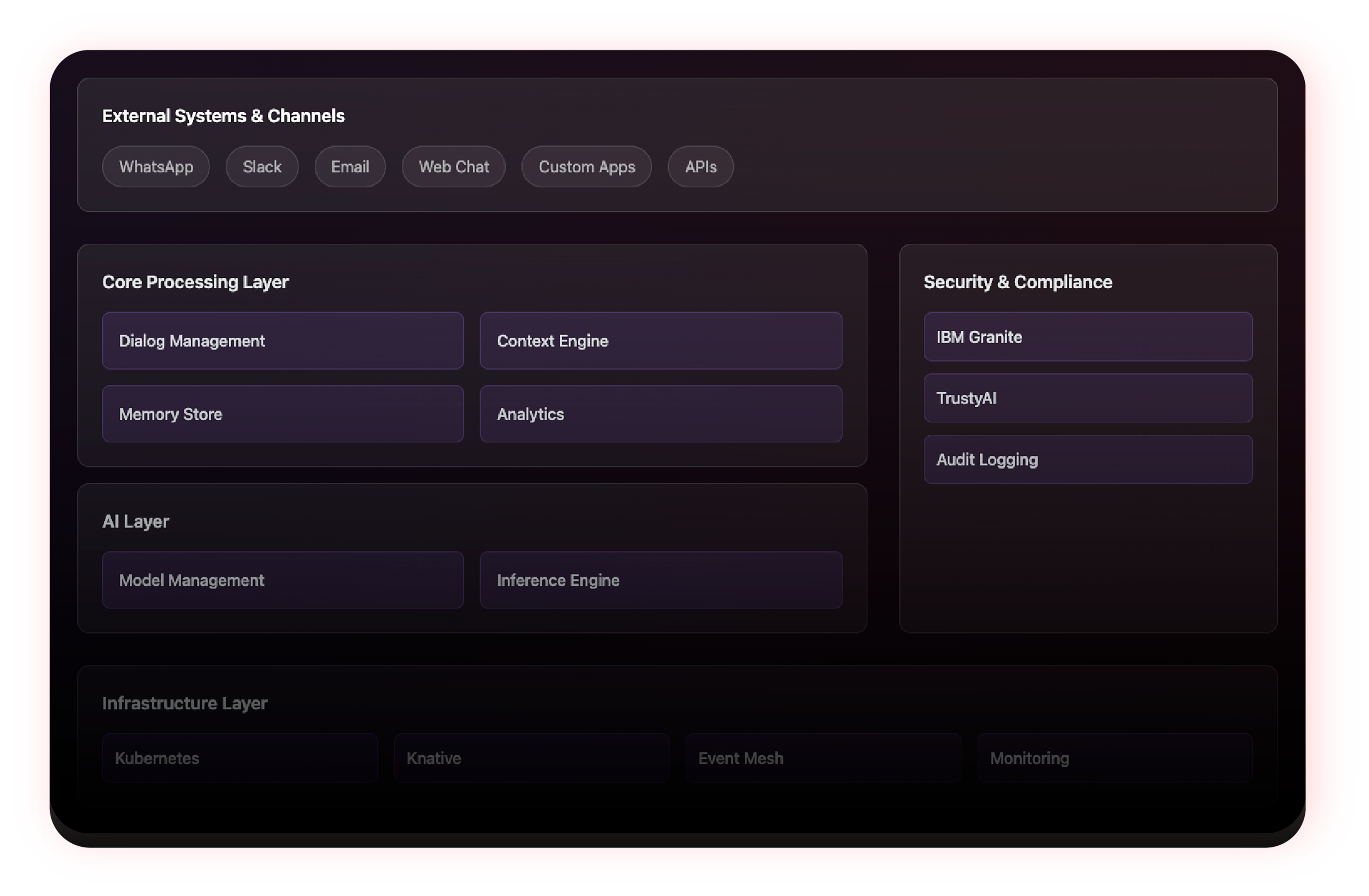 Ofrece soporte nativo para distintos canales de interacción, como WhatsApp, Slack, Email, chat y otros, con enrutamiento fluido de mensajes entre servicios mediante Knative Eventing.